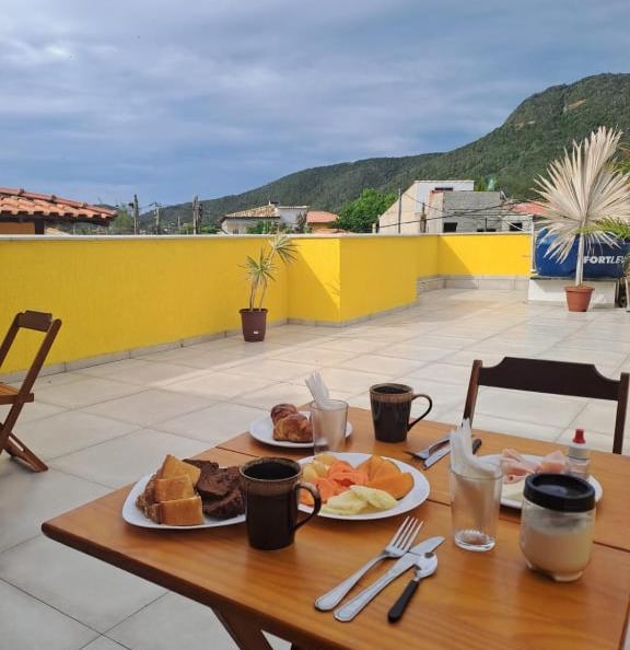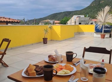 Espaço para comer e relaxar com vista para o mar e a montanha
