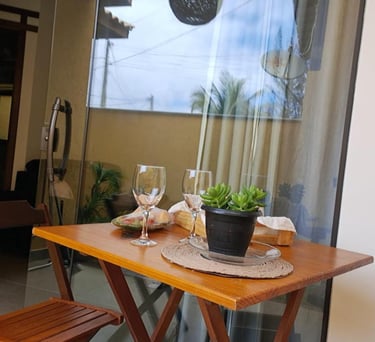 Suíte Brisa aconchegante para 2 hóspedes, com frigobar, chaleira elétrica, banheiro privativo, Wi-Fi e conforto a poucos passos do mar.