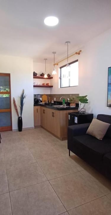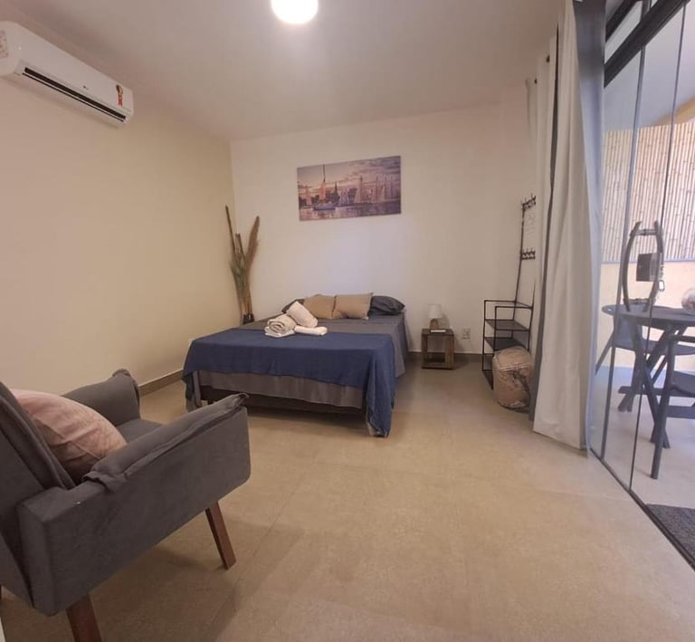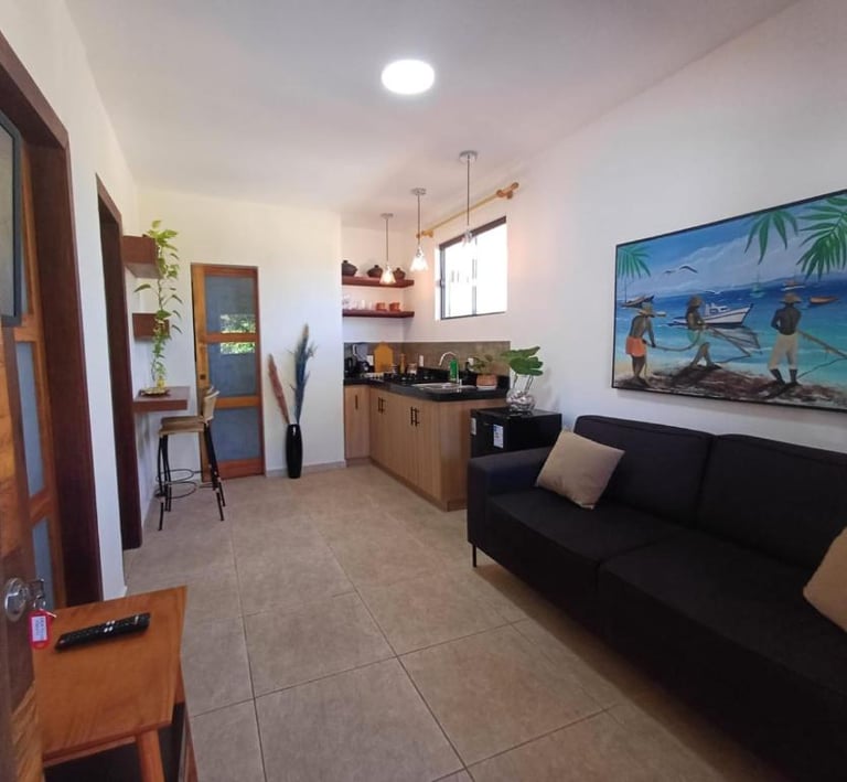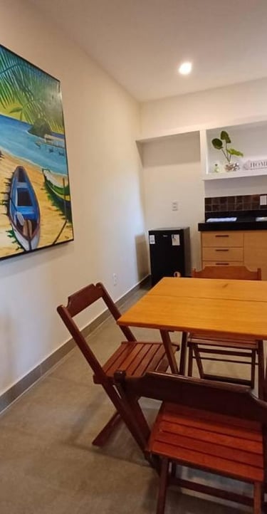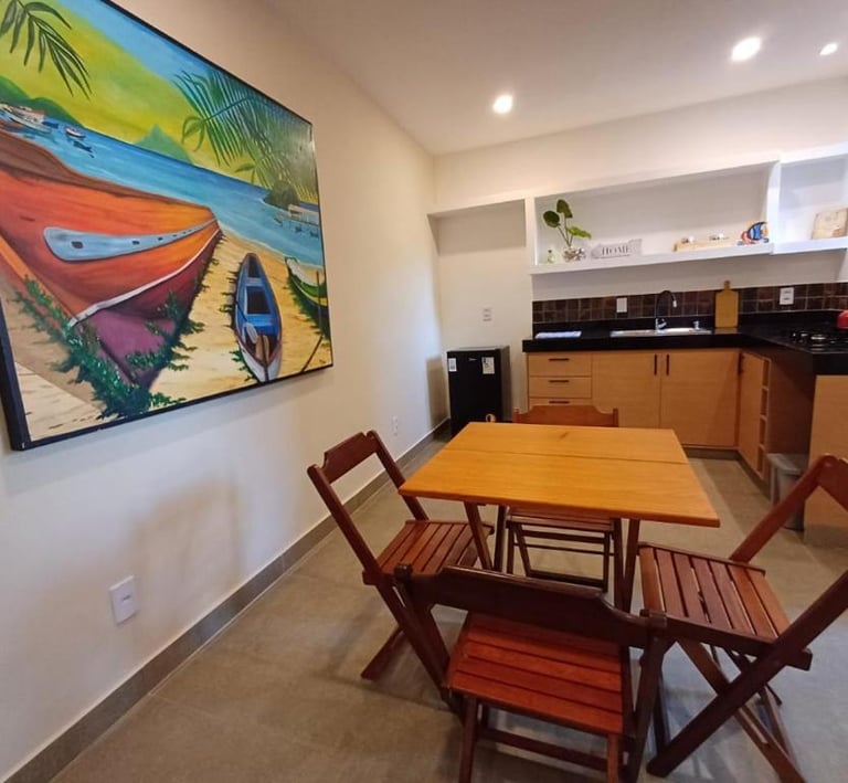 Loft amplo e completo, com kitchenette grande e equipada, cama marinera para até 3 hóspedes, Wi-Fi, banheiro privativo e todo o conforto para sua estadia perto do mar.